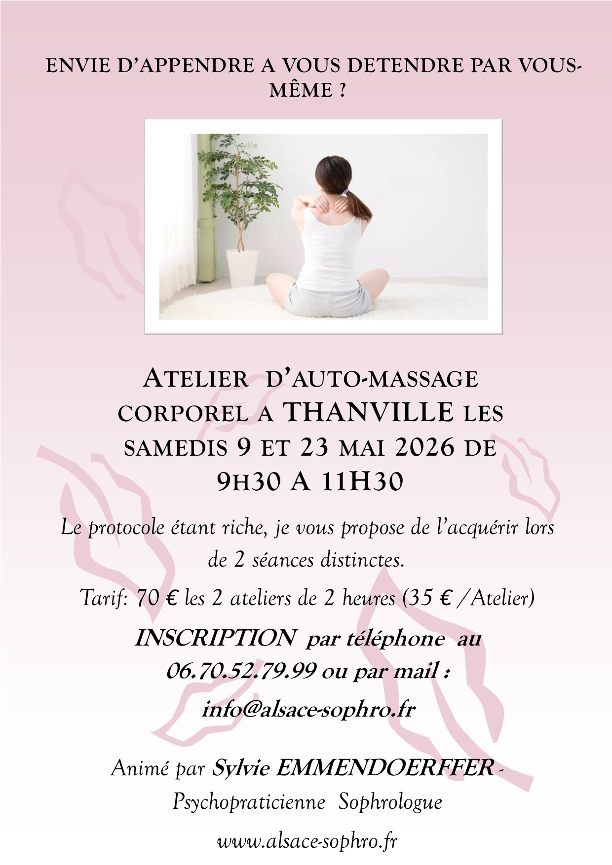 Sophrologue, psychopraticienne et instructrice de massage pour bébé depuis 2009, je vous propose lors de ces ateliers d'acquérir les gestes de l'auto-massage en pleine conscience, dans une alliance entre sophrologie existentielle et soins corporels. La visée est que vous puissiez ensuite vous relaxer en toute autonomie, tranquillement chez vous dans les meilleures conditions. Les bienfaits du massage sont nombreux :