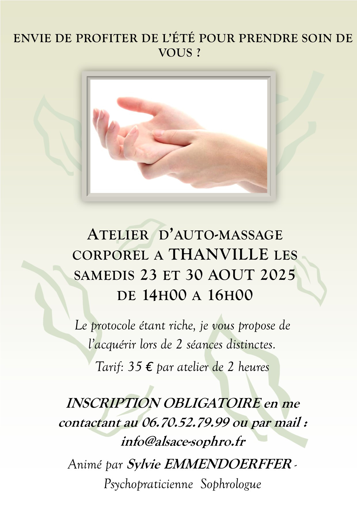 Sophrologue, relaxologue et instructrice de massage pour bébé depuis 2009, je vous propose lors de ces ateliers d'acquérir les gestes de l'auto-massage en pleine conscience, dans une alliance entre sophrologie existentielle et soins corporels. La visée est que vous puissiez ensuite vous relaxer en toute autonomie, tranquillement chez vous dans les meilleures conditions. Les bienfaits du massage sont nombreux :